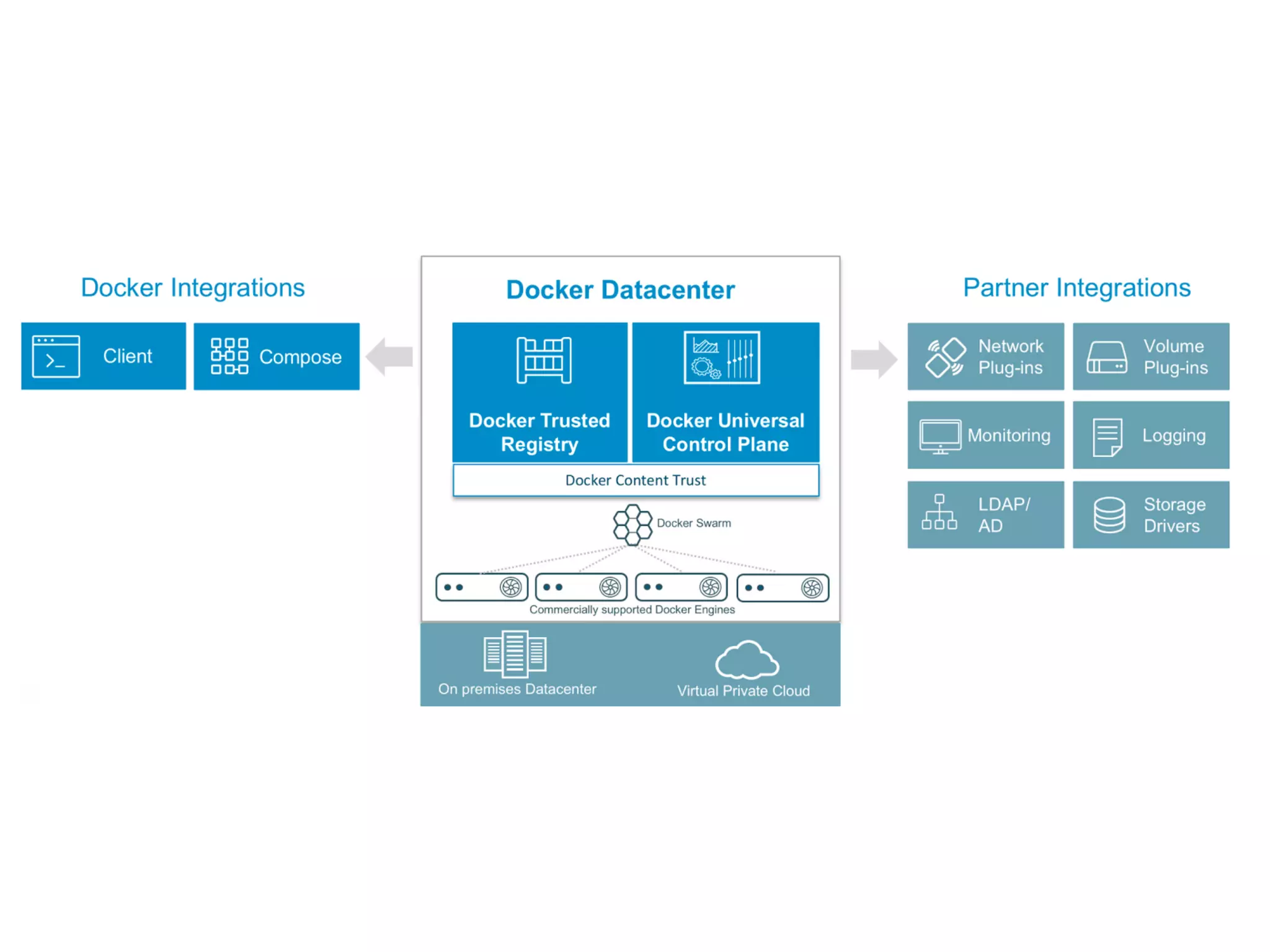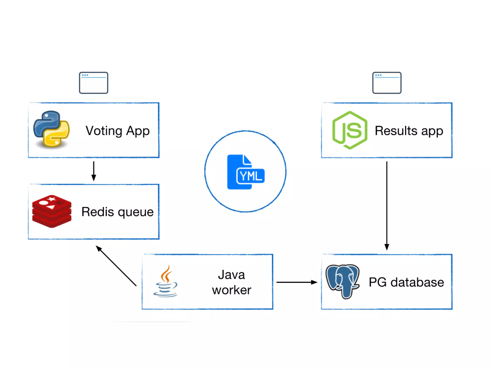 The document discusses the setup of a Docker-based application with multiple services including a voting app, result app, worker, Redis, and PostgreSQL database using a Docker Compose configuration. It highlights the use of Docker for managing distributed applications and mentions Docker's public beta offerings for Mac, Windows, AWS, and Azure. Additionally, it references commands for building and deploying the application using Docker Compose and orchestrate tools.