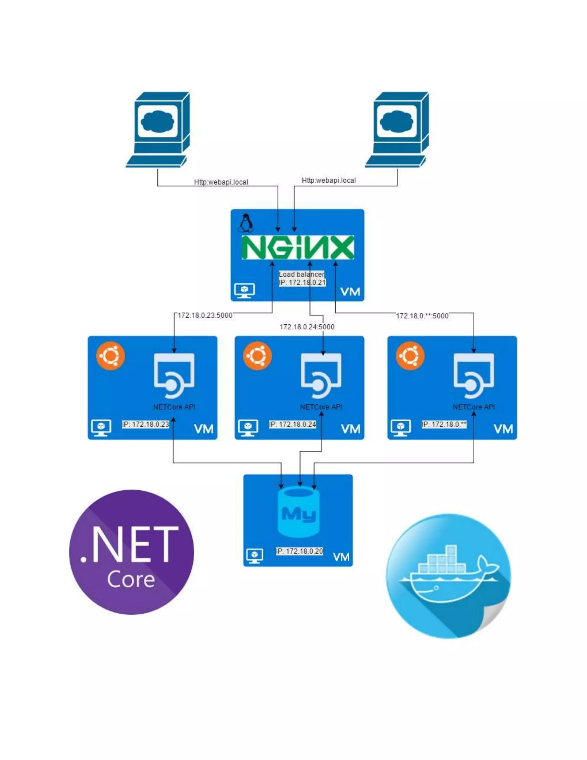 1) The document describes how to create a .NET Core web API application using 4 Docker containers: NGINX load balancer, 2 Core API containers, and a MySQL database container.