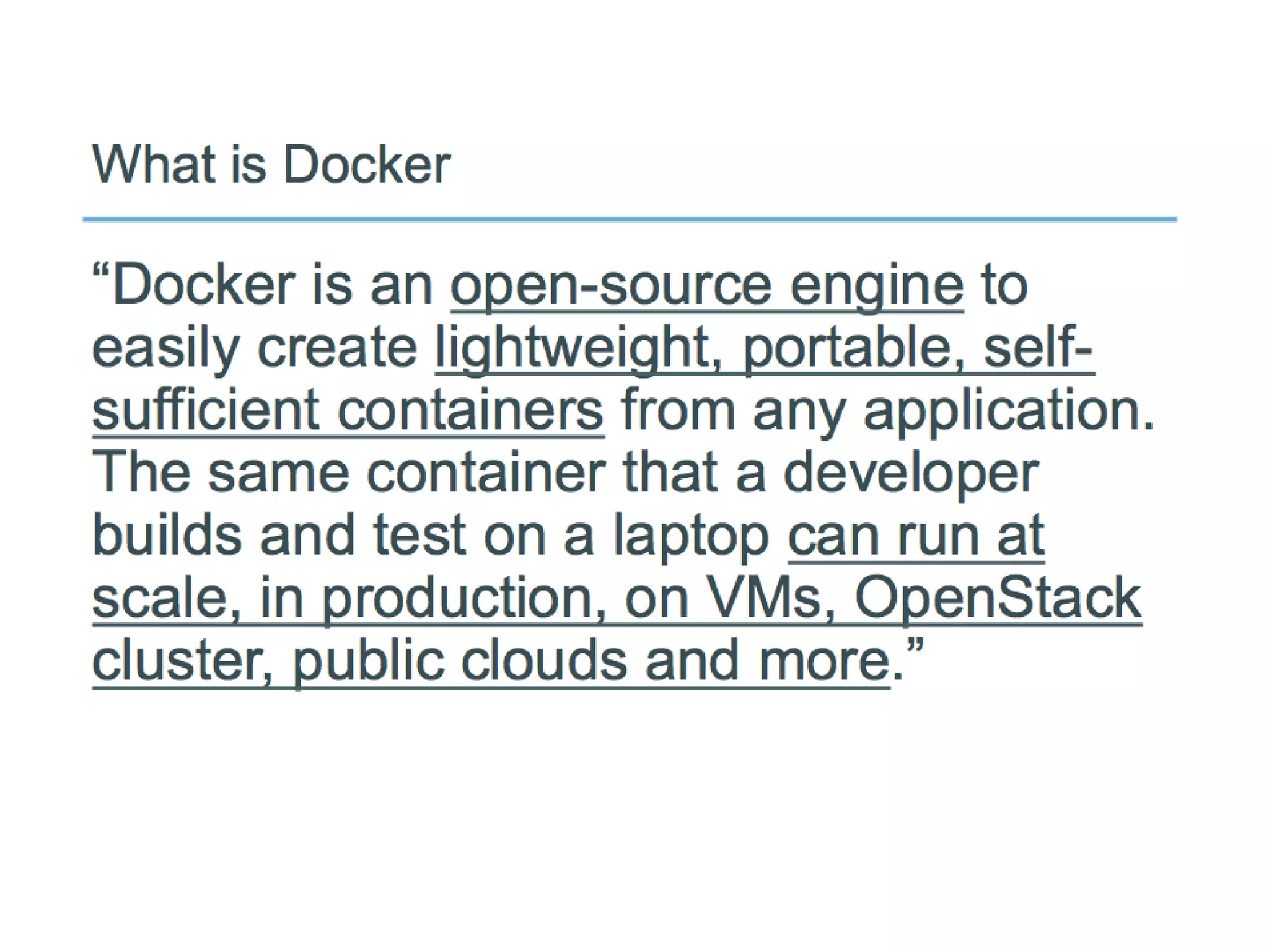 This document provides an overview of Docker's growth and ecosystem over the past 15 months since its launch in March 2013. It highlights the large community of over 460 contributors and 250+ meetup groups, along with over 2.75 million downloads and 6,700 projects on GitHub using Docker. The document also thanks the individuals and projects that helped make Docker possible, including various open source projects, as well as some of the early adopter users and partners helping to build the Docker ecosystem.