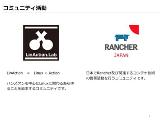 + Action ハンズオンを中心にLinuxに関わるあらゆ ることを追求するコミュニティです。 2 日本でRancher及び関連するコンテナ技術 の啓蒙活動を行うコミュニティです。