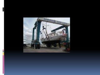 Docks are enclosed areas for berthing ships to facilitate loading and unloading cargo. They can be classified as wet docks, also called harbor docks, which are used for berthing ships to load and unload passengers and cargo, or dry docks, which are used for ship repairs. Docks need to provide a uniform water level and shelter from tides to efficiently transfer cargo and passengers. Their shape is usually straight to accommodate ships, with common designs including rectangular, diamond, and inclined quay docks. Dry docks include graving docks, floating dry docks, marine railways, ship lifts, and slipways used for repairs and shipbuilding.