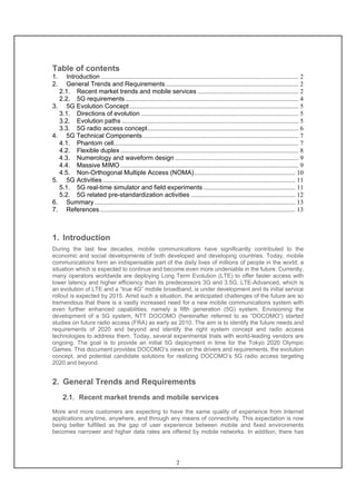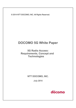 This document discusses NTT DOCOMO's views on 5G mobile network requirements, concepts, and technologies. It outlines the need for 5G networks to support 1000x higher capacity, 100x more connected devices, and 1ms latency to enable new services like remote monitoring, augmented reality, and high resolution video. DOCOMO proposes a dual-layer 5G network using both existing lower bands for coverage and new higher bands for capacity. Key 5G technologies include exploiting massive MIMO, new waveforms, and non-orthogonal multiple access to achieve these goals and integrate lower and higher frequency bands.