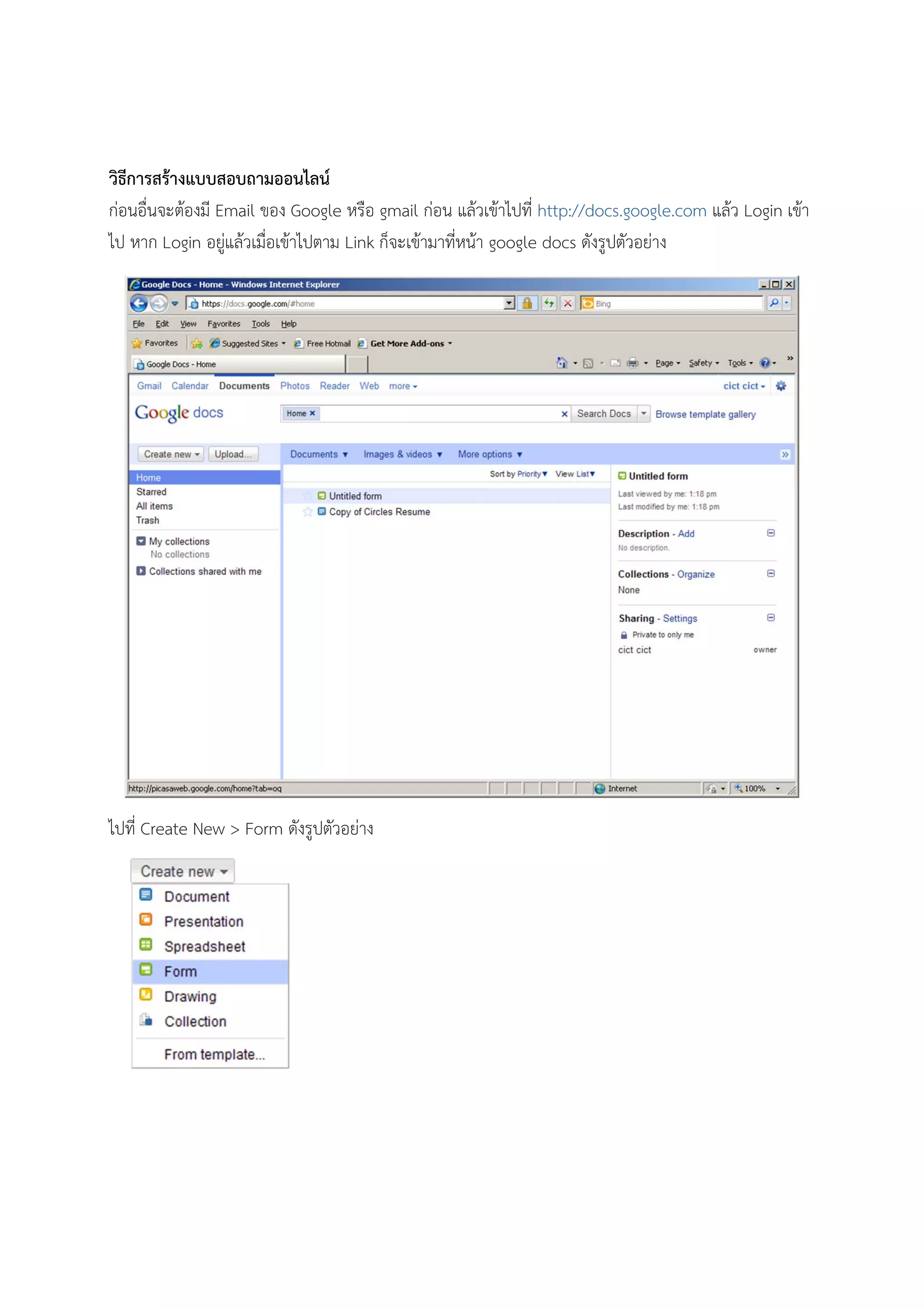 Google หรือ gmail ก่อน แล้วเข้าไปที่ http://docs.google.com แล้ว Login เข้า ไป หาก Login อยู่แล้วเมื่อเข้าไปตาม Link ก็จะเข้ามาที่หน้า google docs ดังรูปตัวอย่าง ไปที่ Create New > Form ดังรูปตัวอย่าง