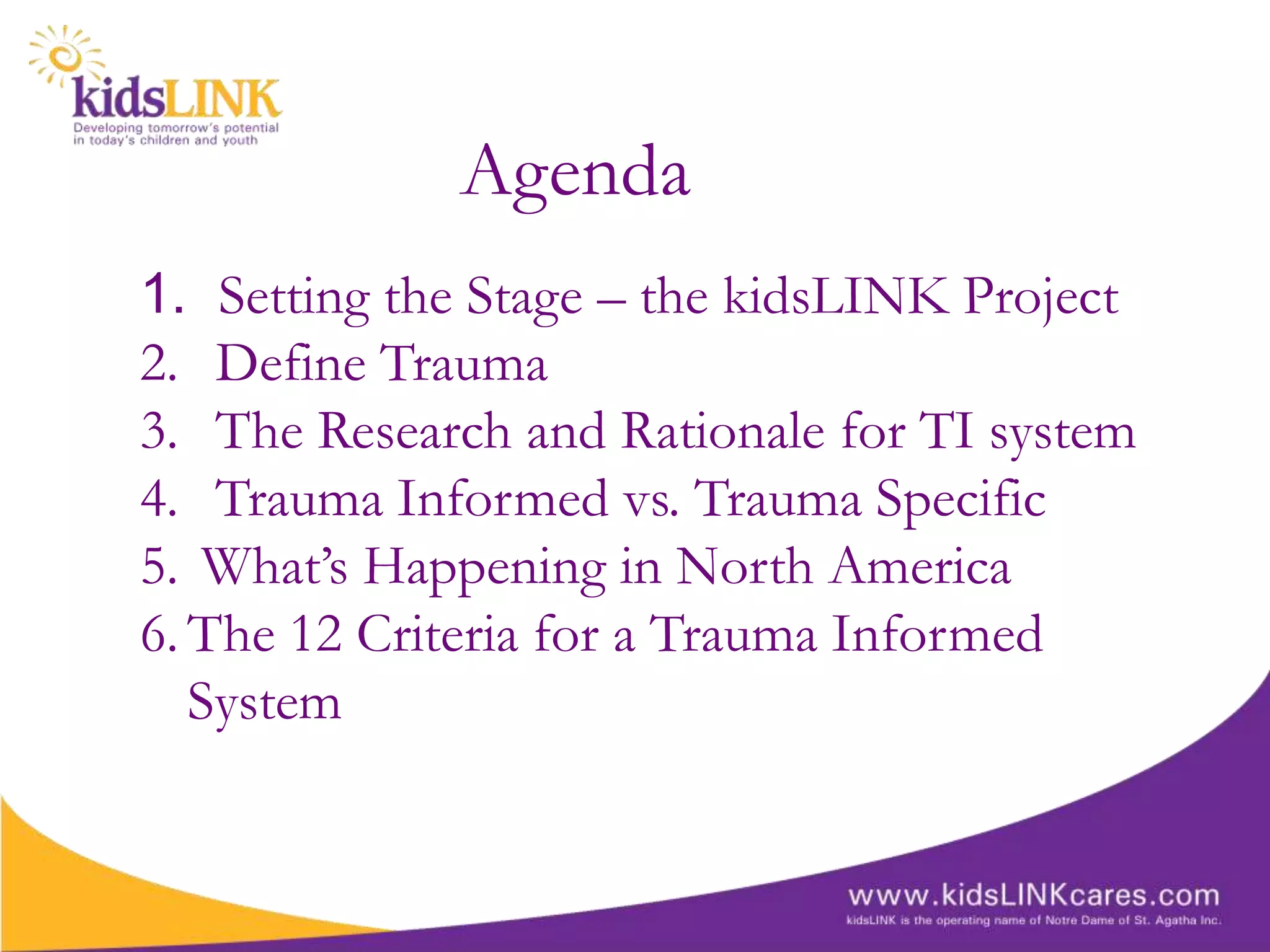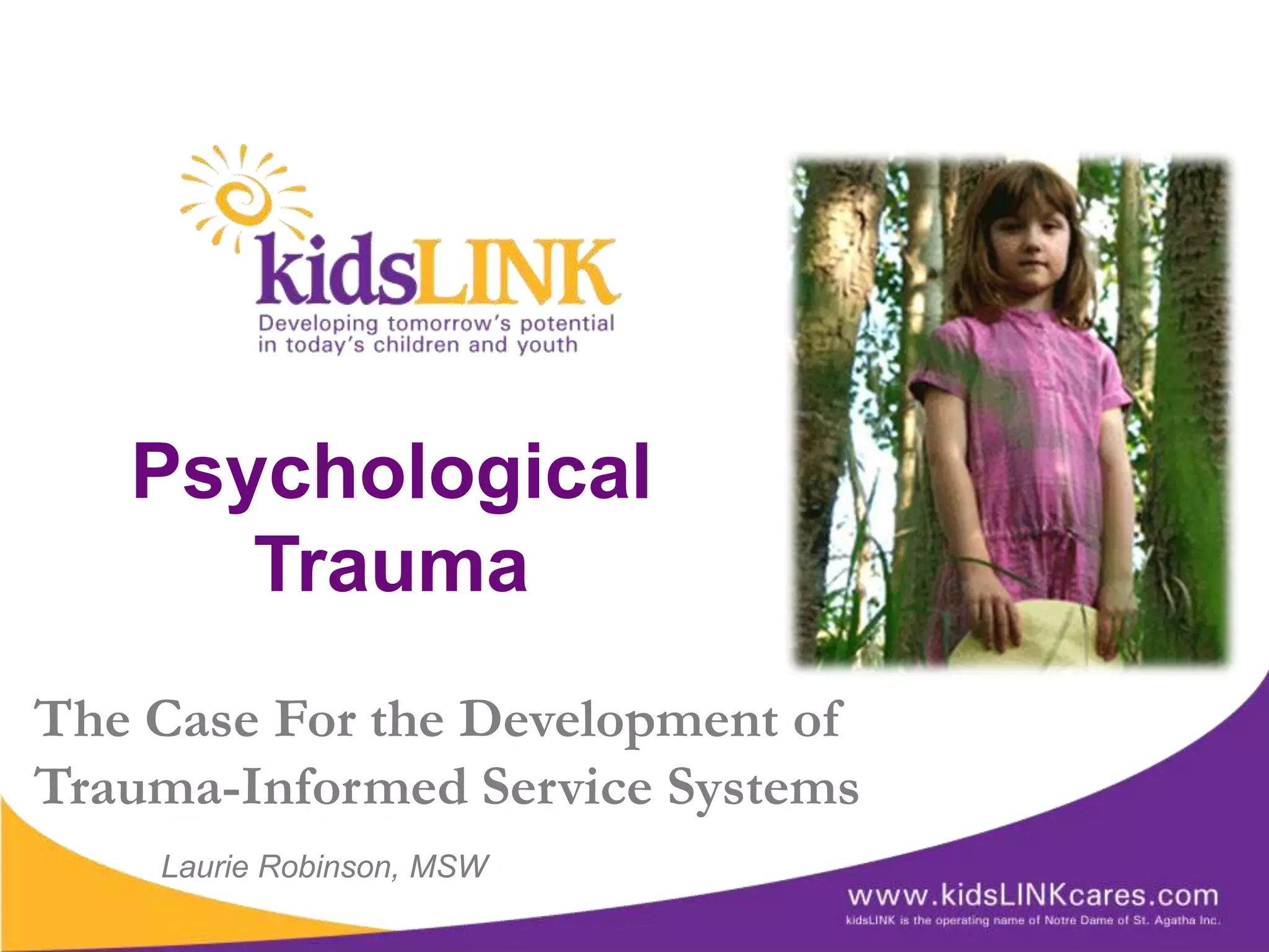 This document discusses the rationale for developing trauma-informed service systems. It begins by defining psychological trauma and reviewing research showing high rates of trauma in vulnerable populations. Trauma affects brain development and can cause lasting negative impacts. The document advocates for a universal precautions approach and trauma-informed care across organizations, rather than just trauma-specific treatment. It outlines 12 criteria for building trauma-informed mental health systems, such as having trauma-focused policies, training staff, and involving trauma survivors. The goal is to minimize re-traumatization and promote healing.