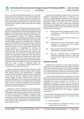This document proposes a blockchain-based system called DocsInBlocks to simplify the process of verifying candidates' credentials for education and employment. It aims to address issues with the current manual verification process, such as forgery of documents, lengthy verification times, and large paperwork requirements. The proposed system would use Hyperledger Fabric blockchain to store educational and experience documents immutably, allowing quick and secure verification of candidates' credentials. Organizations, candidates, and educational institutions would be able to access and verify documents on the blockchain network. This system could streamline the verification process and reduce costs compared to the current methods.