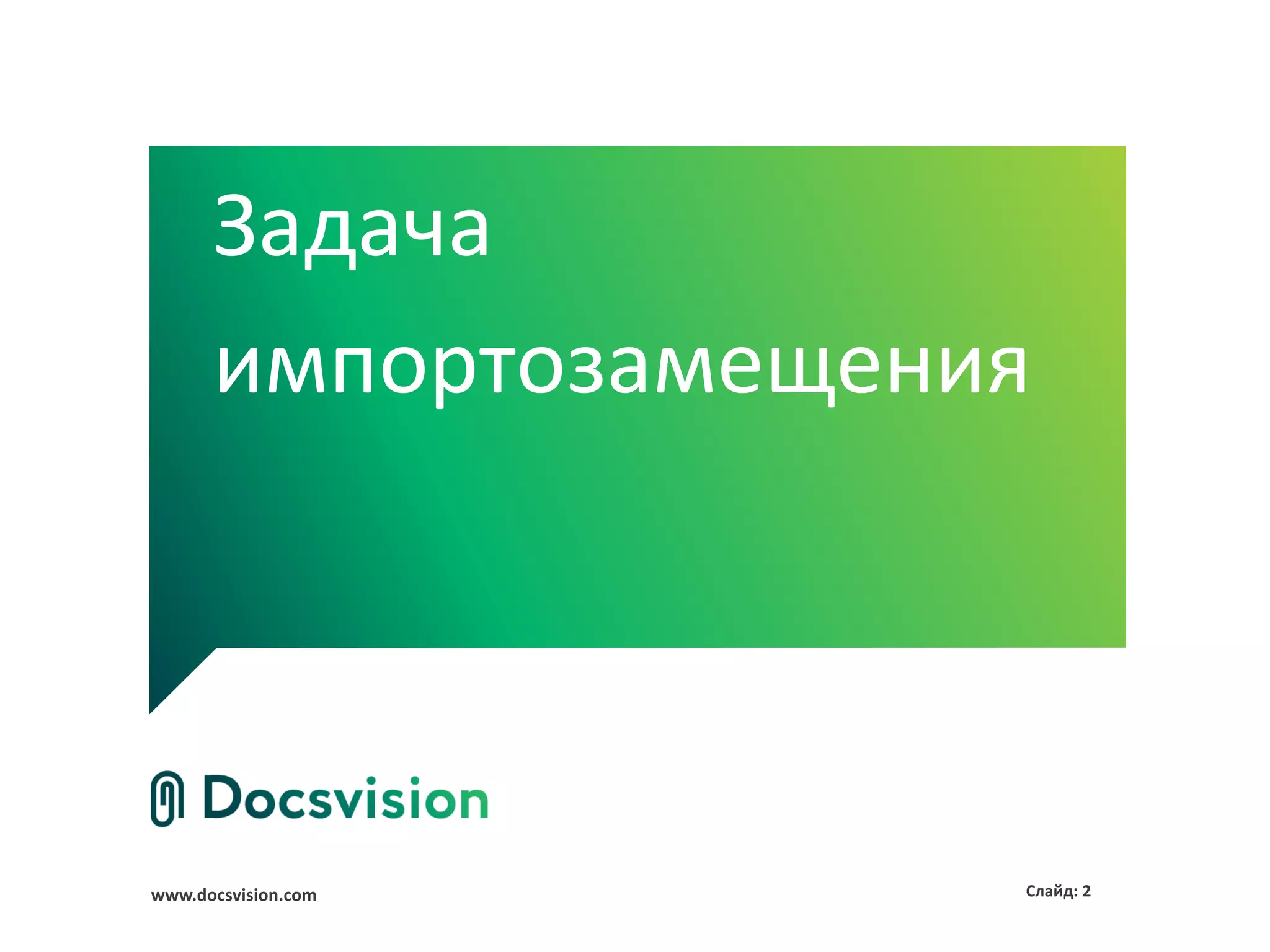 Документ представляет предложение компании 'Доксвижн' по импортозамещению для российских предприятий, основываясь на внедрении отечественной системы электронного документооборота (СЭД). Основные акценты сделаны на конкурентоспособности системы, ее соответствию российским требованиям безопасности, а также на успешных примерах замещения зарубежных систем. В документе также обсуждаются преимущества данного решения, включая возможности адаптации и поддержки со стороны разработчиков.