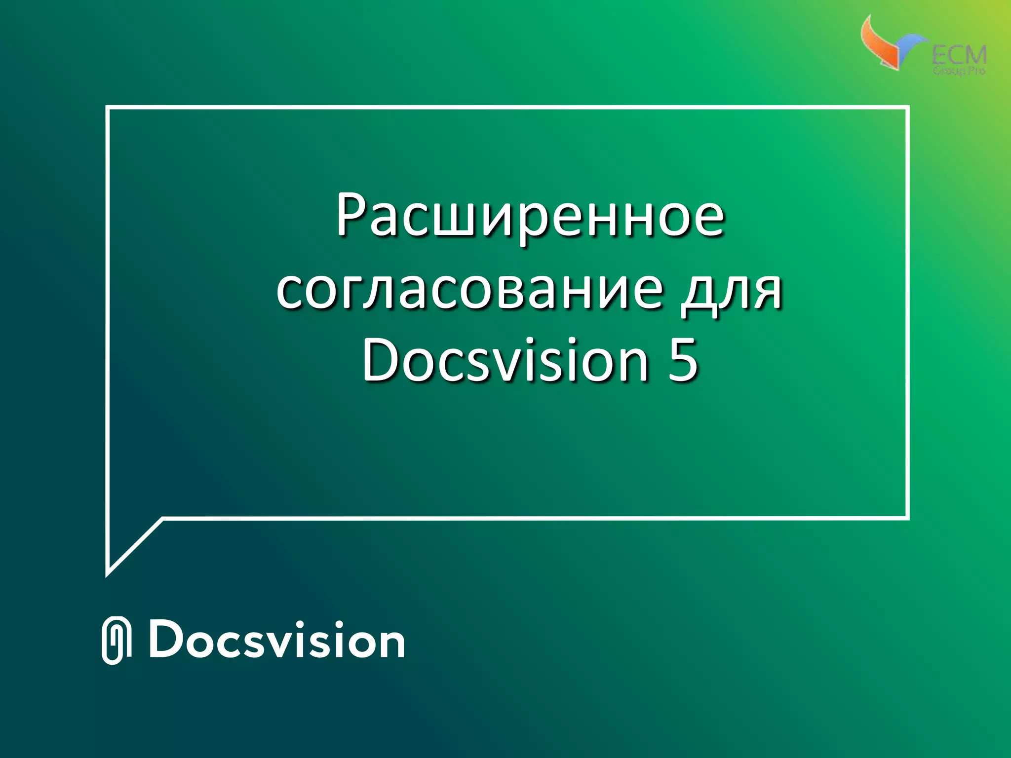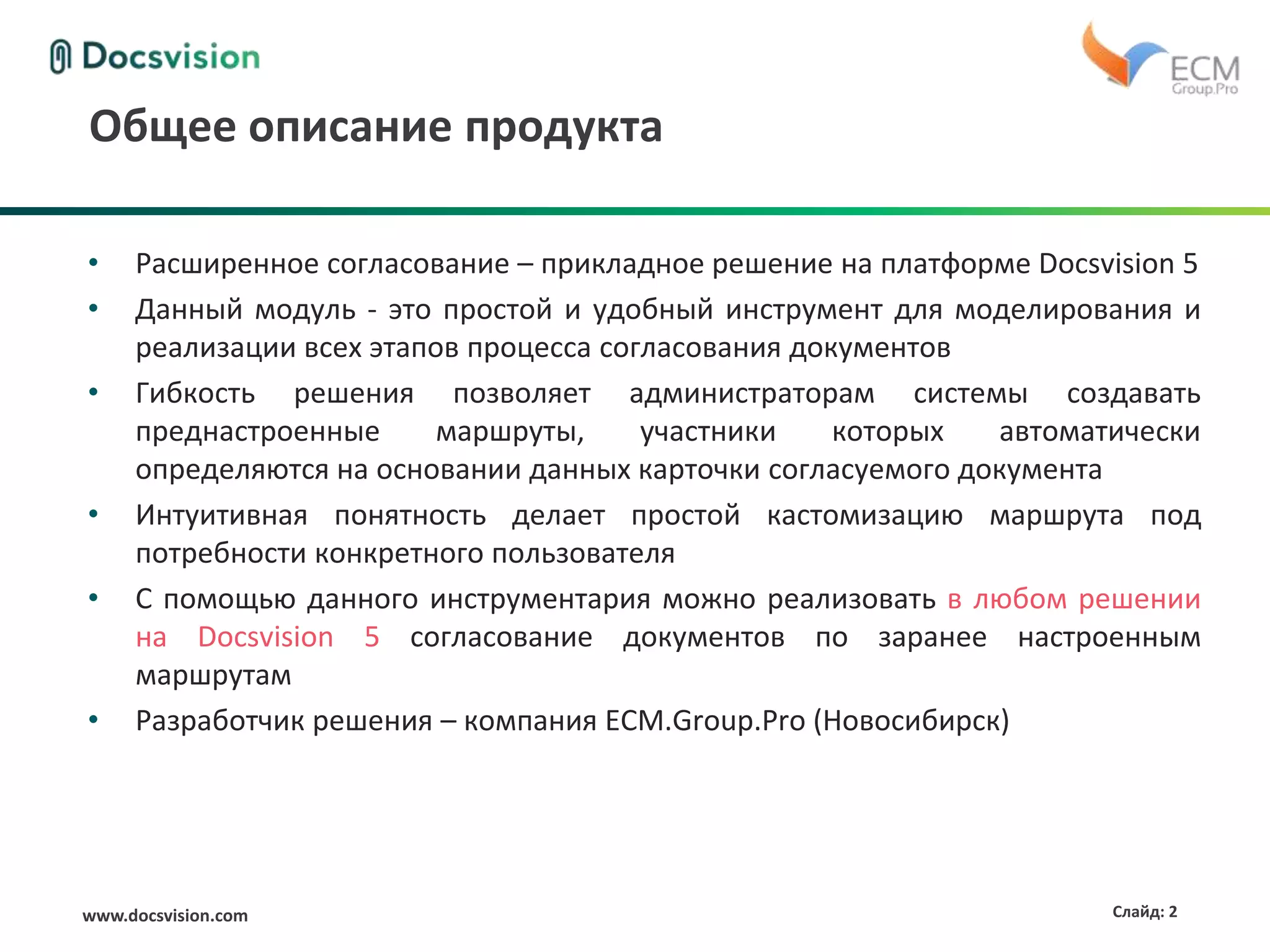 Документ представляет собой описание модуля 'расширенное согласование' для платформы docsvision 5, который позволяет удобно настраивать и управлять процессом согласования документов. Основные функции включают создание преднастроенных маршрутов, добавление участников, отслеживание статуса и возможность пересогласования. Разработчик модуля - компания ecm.group.pro из Новосибирска.