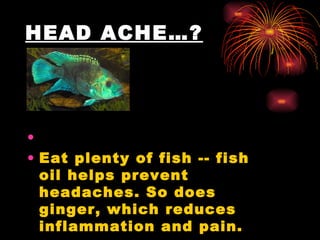 The document provides health advice related to various common ailments and recommends foods to help prevent or treat each one. It recommends eating fish and ginger for headaches, yogurt for fever, tea for stroke prevention, honey for insomnia, onions for asthma, fish for arthritis, bananas and ginger for an upset stomach, cranberry juice for bladder infections, pineapple for bone problems, oysters for memory problems, garlic for colds, red peppers for coughs, and various fruits and vegetables to help prevent different cancers and other issues. It emphasizes the benefits of fruits, vegetables, nuts, and other whole foods for overall health and disease prevention.