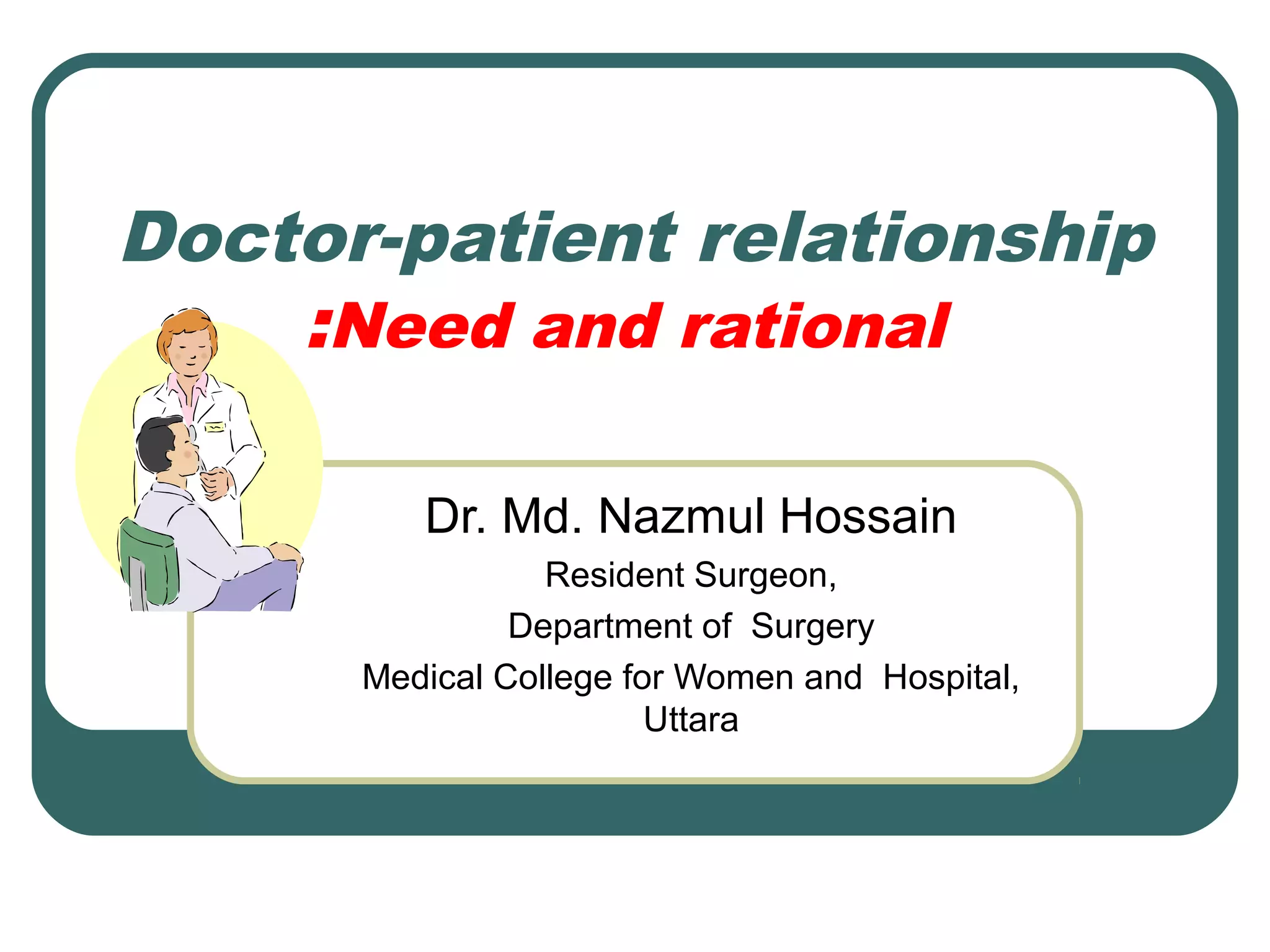 This document discusses the doctor-patient relationship and outlines different types of relationships. It notes that traditionally the relationship has been paternalistic, with the doctor in control and the patient submissive. However, there is a shift toward relationships with shared control and mutuality. The document also examines barriers to effective communication from both the doctor and patient perspectives and provides recommendations for developing a better relationship through openness, active listening, and empowering patients.