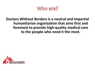 Doctors Without Borders is a neutral and impartial humanitarian organization that aims to provide high-quality medical care to those in need regardless of their country, political beliefs, or religion. They respond rapidly to crises caused by armed conflicts, epidemics, famines, and natural disasters by delivering specialized medical and logistical assistance. The organization communicates with all parties involved in an emergency to gain access to populations in need and save lives through their medical aid work.
