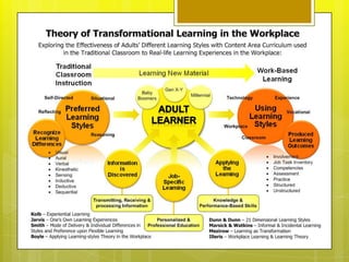 This document outlines a research study on transformational learning in the workplace. It discusses the purpose of comparing learning styles among different generational cohorts and understanding motivational factors. The research design uses grounded theory and comparative analysis. Over 100 participants from 3 age groups in Kentucky will be interviewed. Data collection involves coding interviews to identify learning styles. Results will be assigned to categories related to classroom vs workplace learning styles, advantages, challenges, and barriers. The analysis will code data and compare findings to learning theories. In conclusion, the study examines how learners use different styles in work and considers integrating styles into the workforce.