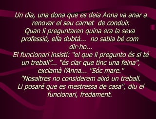 Un dia, unadona que es deia Anna va anar a renovar el seu carnet de conduir. Quan li preguntaren quina era la seva professió, ella dubtà... no sabia bé com dir-ho... El funcionari insistí: “el que li pregunto és si té un treball”... “és clar que tinc una feina", exclamà l’Anna... "Sóc mare." "Nosaltres no considerem això un treball. Li posaré que es mestressa de casa", diu el funcionari, fredament.
