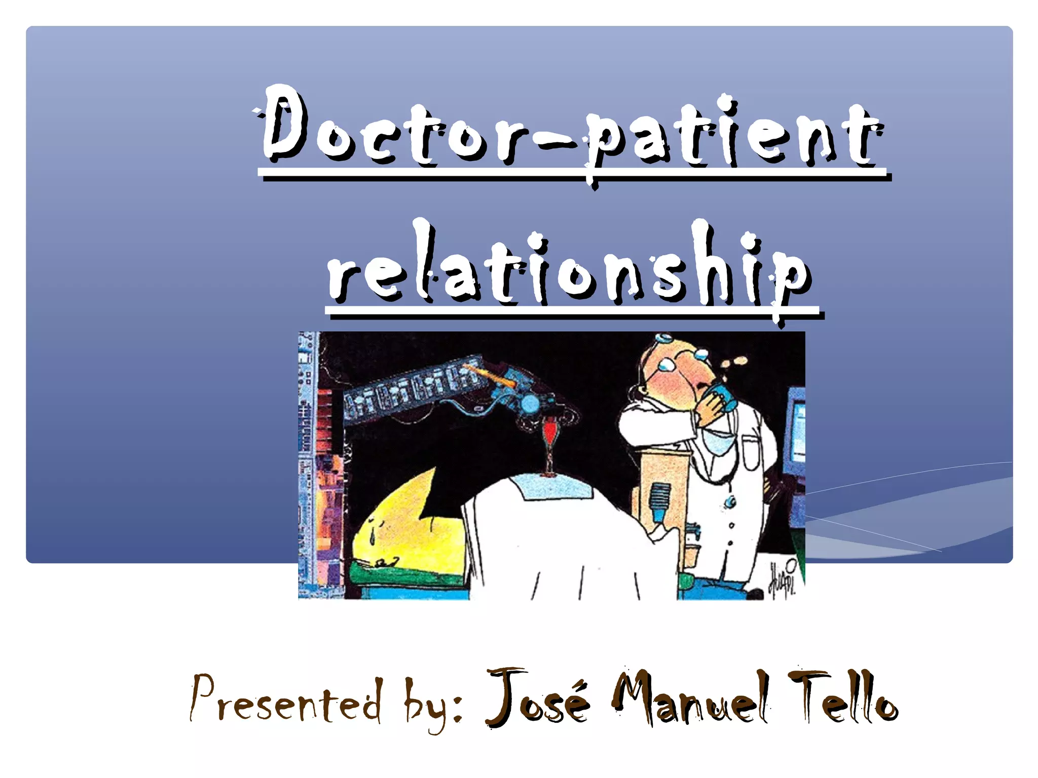The doctor-patient relationship is defined as the interaction established between the physician and patient to restore health, alleviate suffering, and prevent illness. It is characterized by the physician's knowledge, wisdom, and humanity. The relationship requires empathy, rapport, and effective communication from the doctor and anxiety and a desire for help from the patient. A good relationship improves understanding, treatment compliance, and avoids unnecessary interventions and medical errors, making for better care and results.