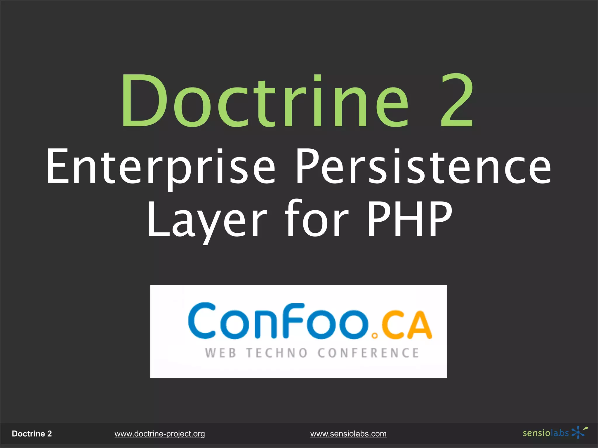 The document provides an overview of Doctrine 2, an object-relational mapper (ORM) for PHP. Some key points: