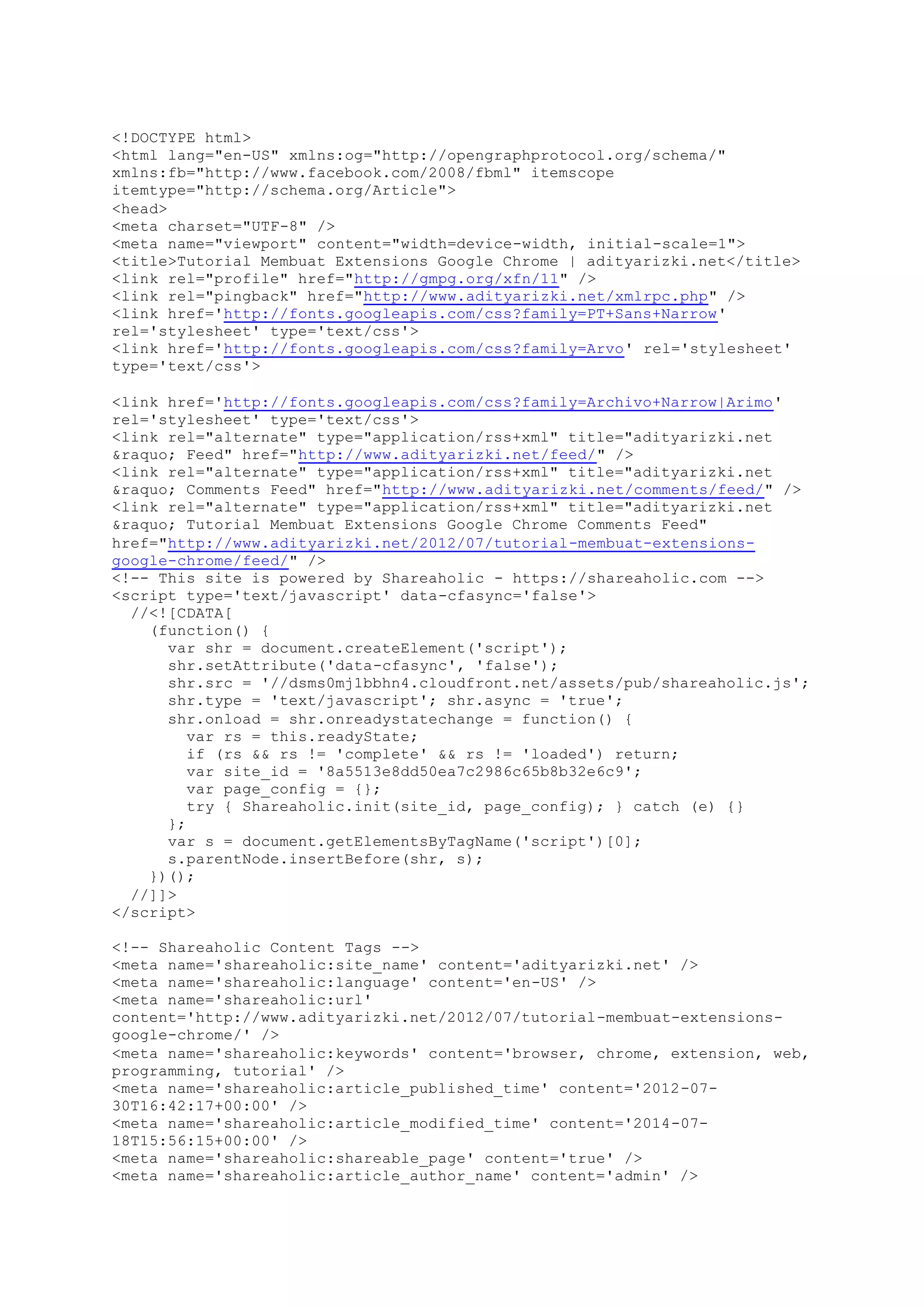 The document is a HTML page from a website about tutorials. It contains metadata and code for setting up the page design, linking to stylesheets, and including scripts. The page is titled "Tutorial Membuat Extensions Google Chrome" which relates to making extensions for Google Chrome. It includes metadata like keywords, descriptions and images to support sharing on social networks.