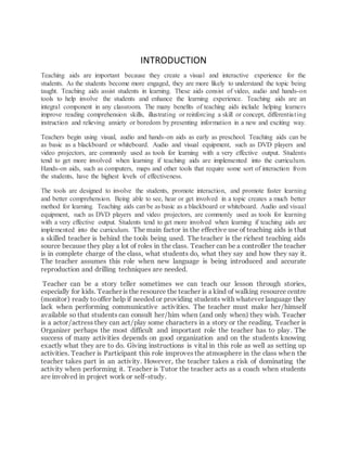 The document discusses the use of pictures and charts as teaching aids. It explains that pictures can be used to teach vocabulary, pronunciation, and retelling stories. Pictures attract students' attention and help them remember lessons. Charts are also an effective visual teaching tool when displayed in the classroom or used during lessons. Teachers can create charts to label concepts or have students make their own charts to organize information. Different types of charts, like Venn diagrams and KWL charts, can help students with tasks like comparing/contrasting and planning their learning. Overall, the document advocates for the use of visual aids like pictures and charts to enhance student engagement and comprehension.