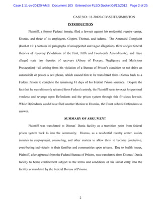 This document is a motion for summary judgment filed by the defendants (Dismas Charities, Inc., Ana Gispert, Derek Thomas, and Lashanda Adams) in a lawsuit brought by the plaintiff (Traian Bujduveanu). The plaintiff, a former federal inmate, sued the defendants related to his transfer from a residential reentry center back to federal prison. The motion argues that 1) the plaintiff cannot sue the private reentry center for constitutional violations, 2) he cannot sue the individual defendants for constitutional violations as they are not state actors, and 3) the federal Bureau of Prisons, not the defendants, was responsible for the plaintiff's custodial placement and transfer. The defendants request that summary