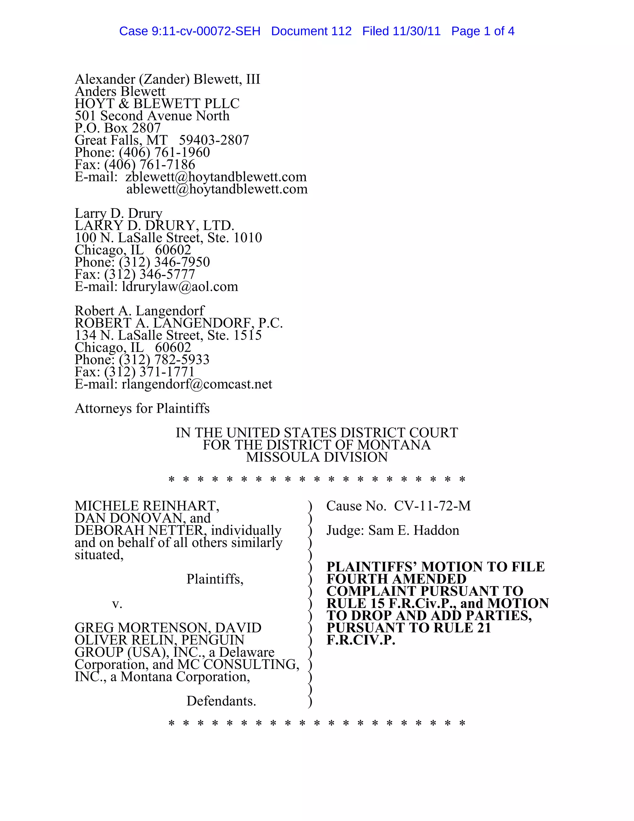 This document is a motion filed by the plaintiffs' attorneys requesting permission from the court to file a fourth amended complaint. Specifically, the motion requests: (1) changing the class definition; (2) removing Michele Reinhart as a plaintiff and adding George and Susie Pfau; and (3) adding claims against additional defendants including Central Asia Institute and MC Consulting for alleged RICO violations. The motion also details why the plaintiffs' counsel believes the additional claims and parties are necessary.