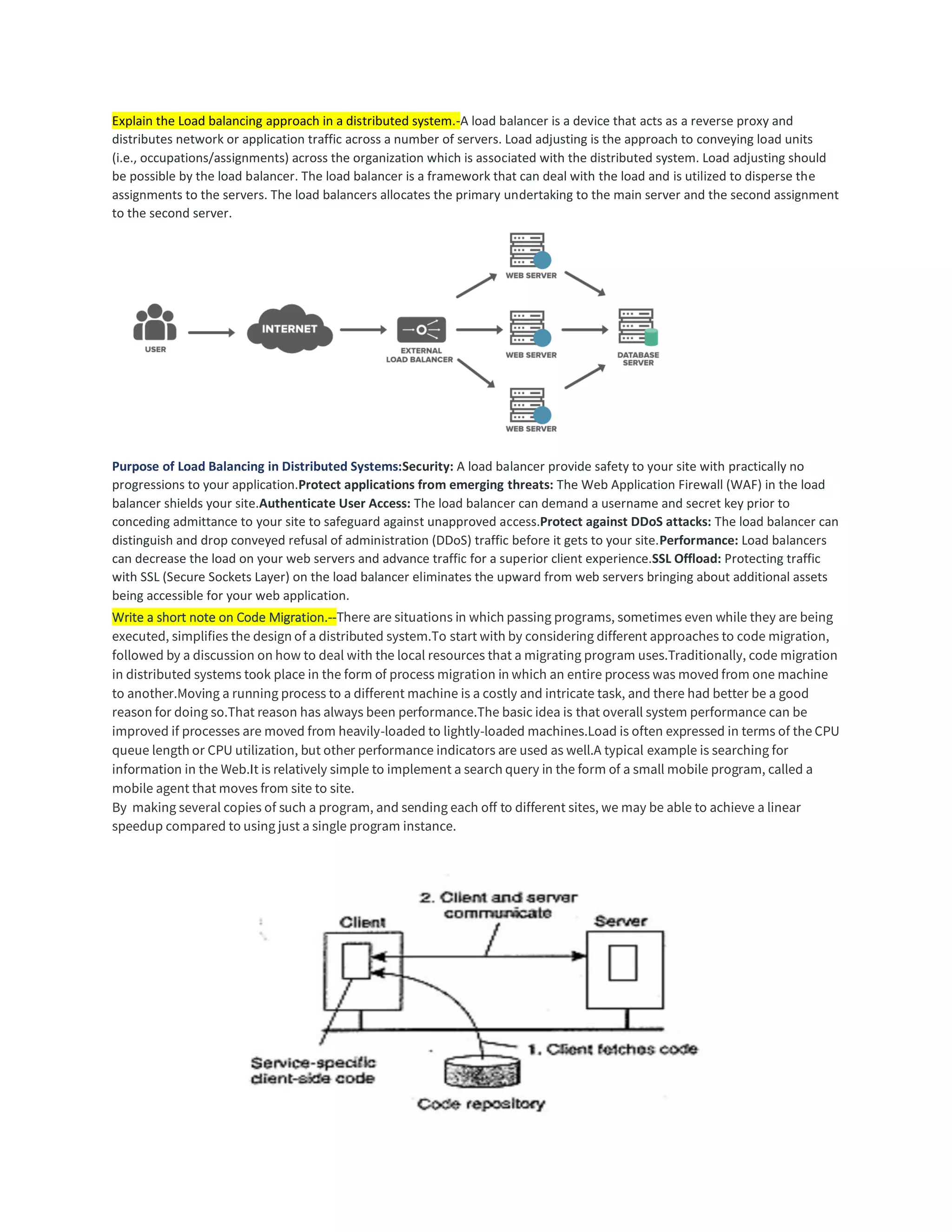 Load balancing is an approach to distributing work units across multiple servers in a distributed system. The load balancer acts as a reverse proxy to distribute network or application traffic evenly among servers. It allocates the first task to the first server, second task to the second server, and so on, to balance loads. Load balancing provides security, protects applications from threats using a web application firewall, authenticates user access, protects against DDoS attacks, and improves performance by reducing load on servers and optimizing traffic.