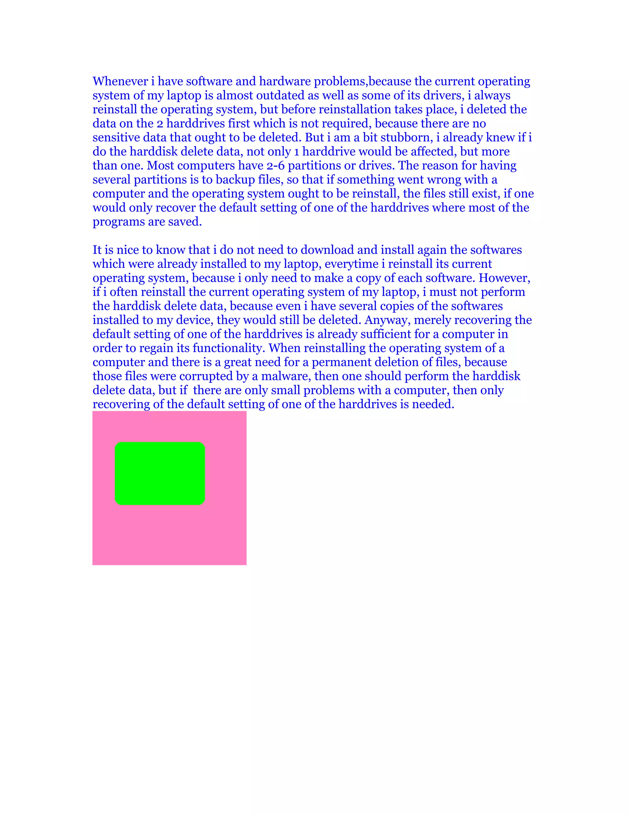 When reinstalling an operating system, deleting data from multiple hard drives is unnecessary and will remove important files and software installations. It is better to only reset the default settings of one hard drive in order to retain backups, installed programs, and avoid reinstalling software. A data wipe of all hard drives should only be done if files are corrupted by malware, otherwise resetting one drive is sufficient to resolve minor issues and regain system functionality after reinstalling the OS.