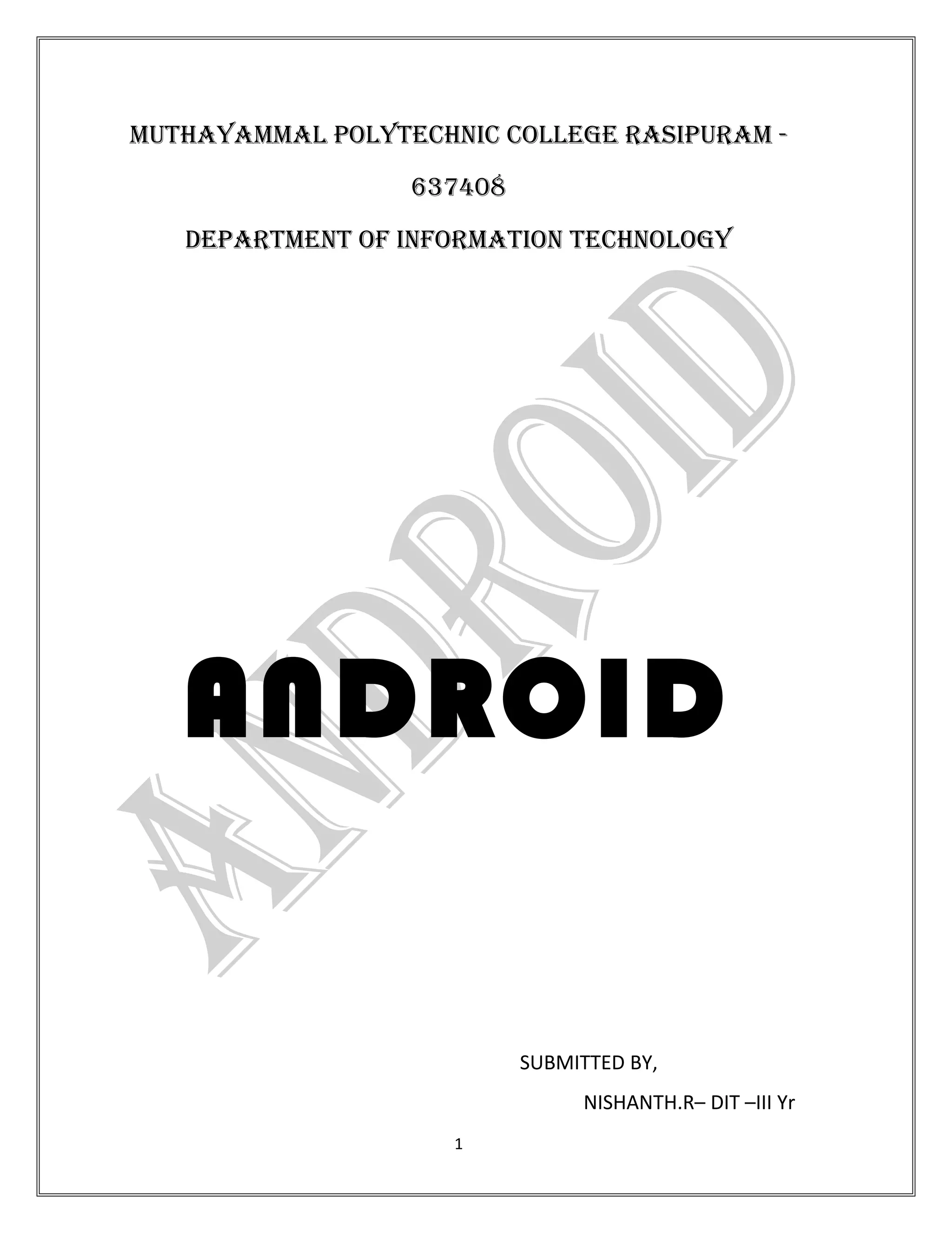 The document discusses Android, an open source software stack and operating system for mobile devices. It begins with background on Android's development by Google and the Open Handset Alliance. It then covers the architecture and components of Android, including the Linux kernel, middleware layers, and apps. It describes the application framework and development process, including building apps using activities, services, and other components. It ends with brief discussions of Android security issues and Google's plans for mobile payment services.