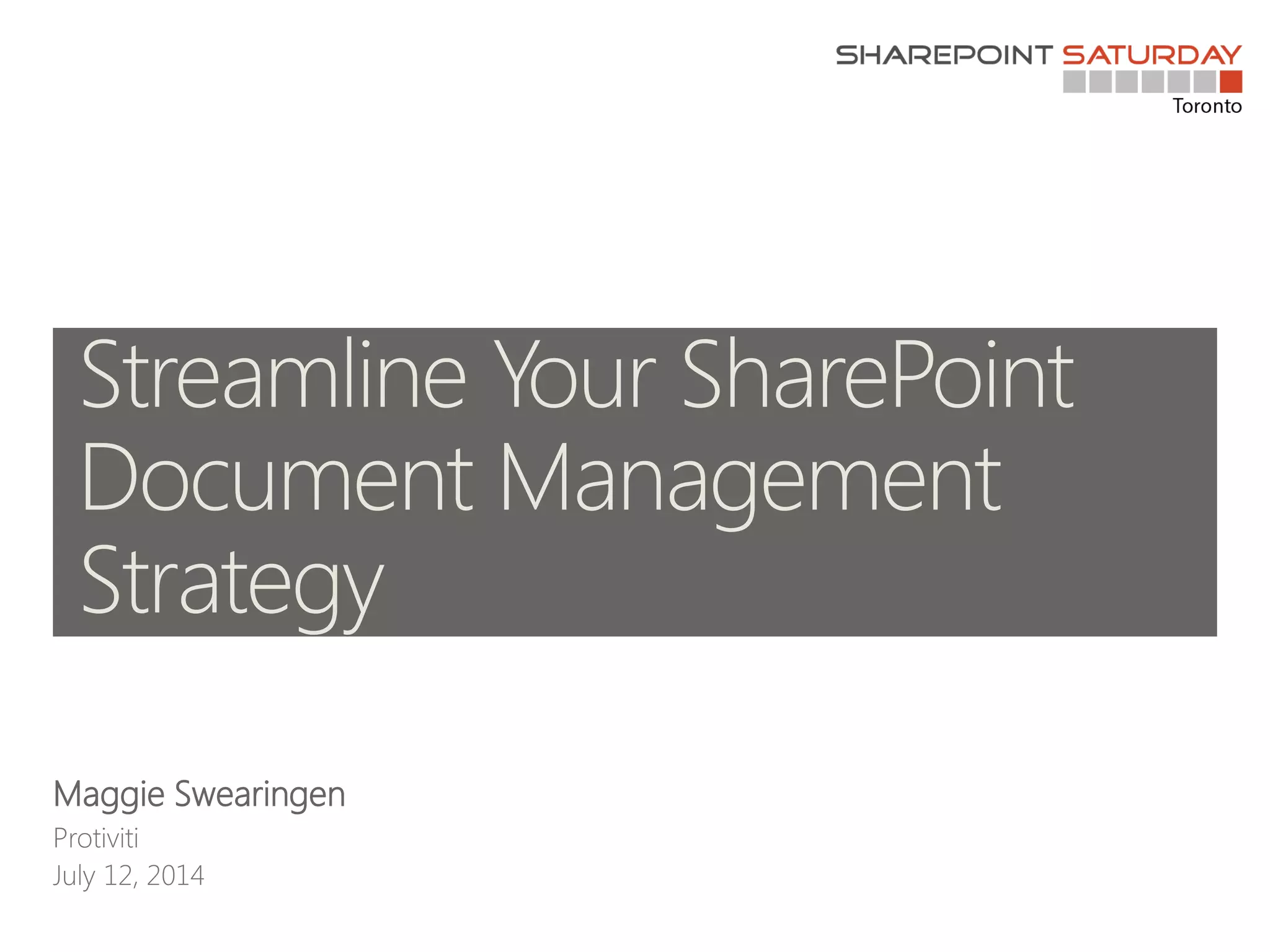 The document discusses best practices for document management in SharePoint. It recommends a four phase process for identifying content and moving it to SharePoint: discover, analyze, refine, and implement. It also describes a document management maturity model with four levels - simple, functional, sophisticated, and mature. Additional topics covered include document sets, document centers, retention policies, governance, and roles and responsibilities.