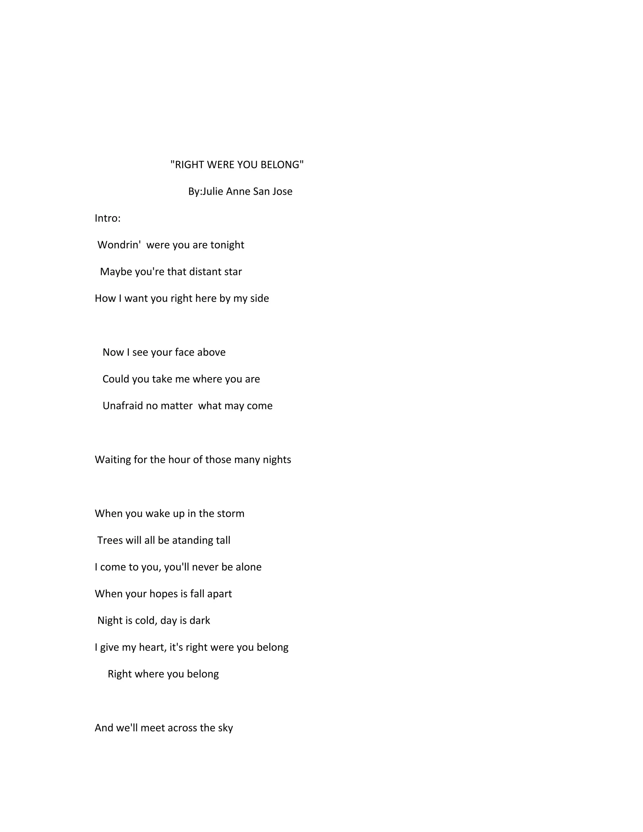 The song lyrics describe longing for a distant lover and promising to be there for them through difficult times. The singer says they want the lover by their side and will take them wherever they need to go without fear. In the chorus, the singer promises that when the lover wakes up in a storm or their hopes fall apart, the trees will still be standing and the singer will come to them so they are never alone, as the singer's heart belongs with them.