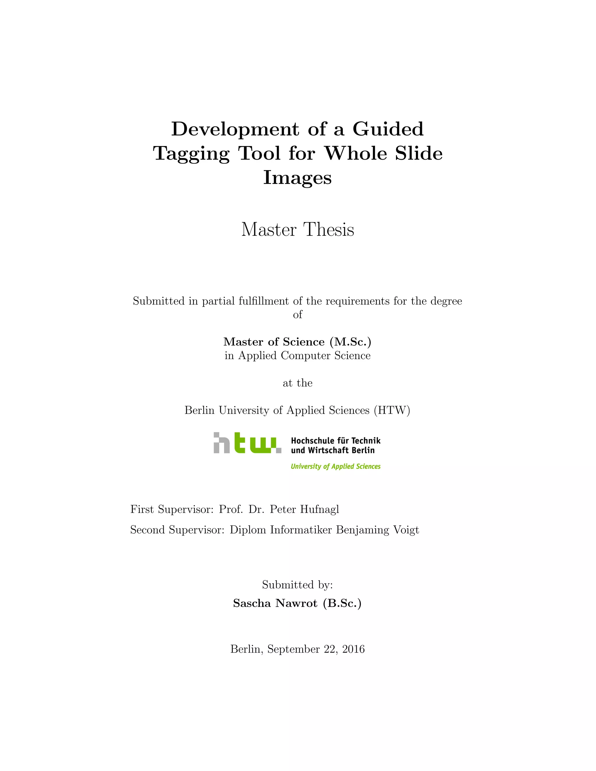 This document is a master's thesis submitted by Sascha Nawrot to Berlin University of Applied Sciences in partial fulfillment of the requirements for a Master of Science degree in Applied Computer Science. The thesis introduces novel, lightweight open source annotation tools for whole slide images that enable deep learning experts and pathology experts to cooperate in creating training samples by annotating regions of interest in whole slide images, regardless of platform or format, in a fast and easy manner. The tools consist of a conversion service to convert whole slide images to an open format, an annotation service for annotating regions of interest, and a tessellation service to extract the annotated regions from the images.