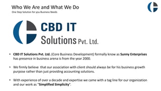 CBD IT Solutions Pvt. Ltd. offers comprehensive business solutions, emphasizing client growth and providing customized Tally implementation since 2000. Their services include a document attachment feature that streamlines operations by organizing important documents linked to financial transactions. The company operates mainly in Mumbai and Navi Mumbai, aiming to enhance the Tally ERP9 experience for its users.