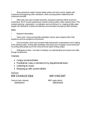 Anaduaka Chima Martin is a recent chemical engineering graduate from Anambra State University seeking a career that utilizes his education and work experience. He has a bachelor's degree in chemical engineering, work experience in quality control and production/marketing roles, and skills in research, teamwork, communication, and learning new skills. His career objective is to obtain a position that allows him to apply his self-motivation, commitment, and ability to work well under pressure or amid changing priorities.