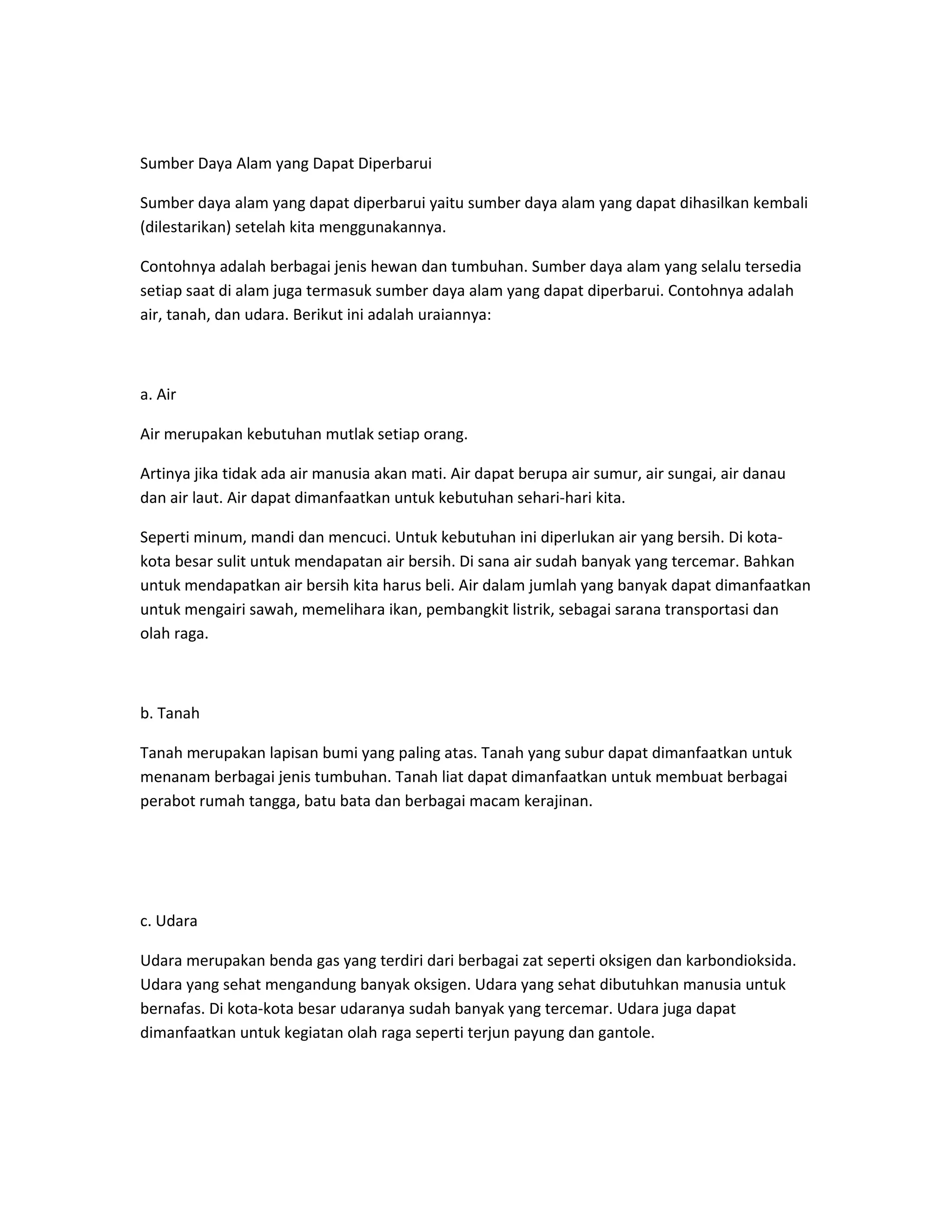 Sumber daya alam yang dapat diperbarui termasuk air, tanah, udara, berbagai jenis tumbuhan dan hewan yang dapat dipulihkan setelah digunakan. Contohnya adalah air yang dapat didaur ulang, tanah subur untuk pertanian, hutan yang dapat ditanam kembali, dan berbagai jenis hewan ternak dan piaraan.
