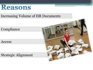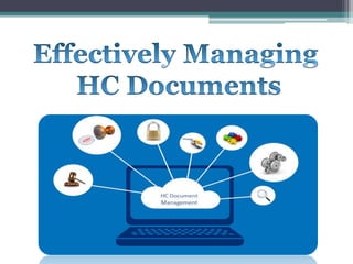 The document outlines a Human Capital (HC) document management system aimed at increasing productivity and managing employee-related documents efficiently. It highlights issues such as time spent searching for information and the need for secure, centralized access to documents across departments. Key objectives include formulating, implementing, and continuously improving the HC document management process to ensure documents are valid, accessible, and align with company regulations.