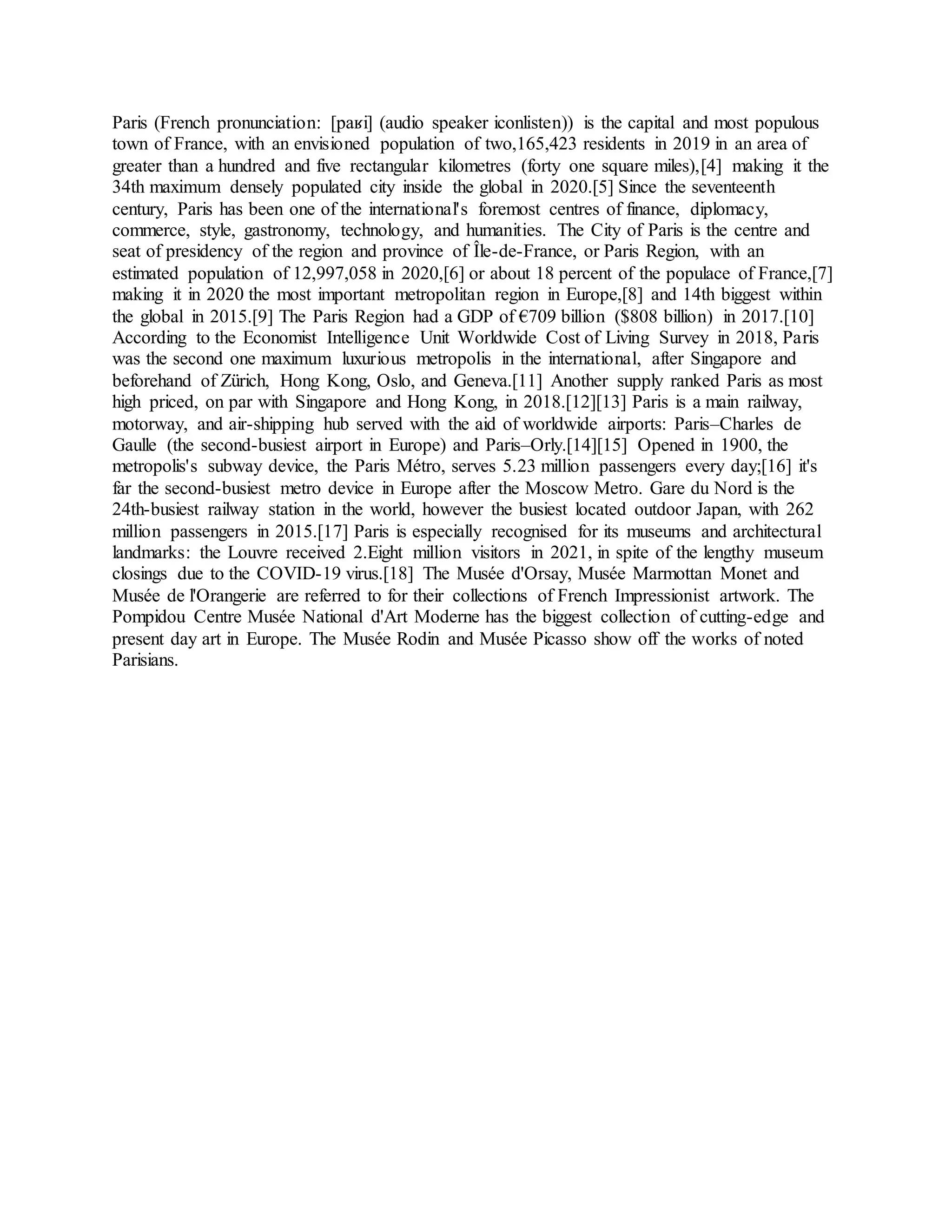 Paris is the capital and largest city of France, with over 2 million residents within its city limits and over 12 million in the metropolitan area, making it one of the largest cities in Europe. As a global center of finance, culture, fashion, and technology, Paris has attracted visitors to its world-famous museums and architectural landmarks for centuries. The city has an extremely efficient transportation network serving its residents and visitors, including one of the busiest metro systems in the world.