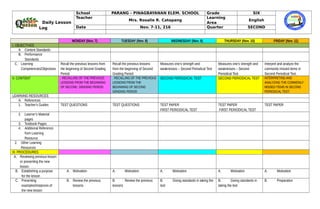 The document is a daily lesson log for a Grade Six English and Filipino class at Pinagbayanan Elementary School, prepared by teachers Rosalie R. Catapang and Gerardo D. Catapang. It outlines the week's objectives, content, procedures for reviewing past lessons and preparing for the second periodical test, as well as resources and reflections on student performance. Additionally, it includes strategies for evaluation and identifying students needing remediation.