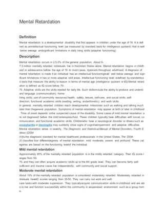 Mental retardation, also known as intellectual disability, is a developmental disability characterized by limitations in intellectual functioning (IQ under 70-75) and adaptive behaviors that are diagnosed before age 18. It occurs in approximately 2-3% of the population and can be caused by genetic, prenatal, childhood, and environmental factors. Mental retardation is classified by severity into four categories: mild, moderate, severe, and profound. Treatment focuses on education, life skills training, supportive living, and family therapy.