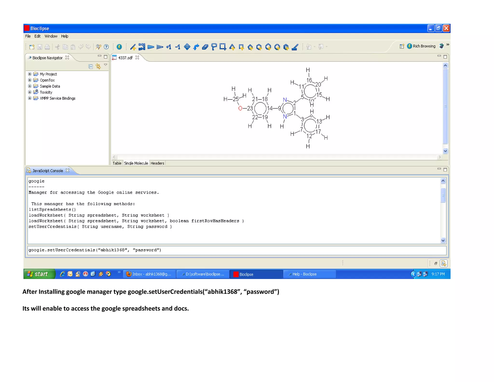 After installing the Google manager and setting user credentials, the document discusses how to access and view Google spreadsheets and documents. It provides commands to see a list of available spreadsheets, load a dataset by specifying the spreadsheet name and sheet, and expresses thanks to the creator of the environment for making it possible.