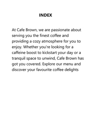 Cafe Brown is dedicated to serving high-quality coffee in a cozy atmosphere, catering to both those seeking a caffeine boost and a calm space to relax. The menu features a variety of options including lattes, americanos, cappuccinos, espressos, and specialty drinks like mochas and caramel macchiatos. Cafe Brown also fosters a community environment, inviting customers to enjoy their offerings while emphasizing quality and warmth.