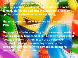 Documentaries aim to document real people and events to allow audiences to form opinions. They use techniques like observation, interviews, dramatization, mise-en-scene, and exposition. Documentaries can be fully narrated, fly-on-the-wall, mixed format, self-reflexive, or docudramas. They typically follow a beginning, middle, end structure and focus on conflict to drive the narrative forward. Elements like music, lighting, and visuals are chosen carefully to shape the intended meaning.