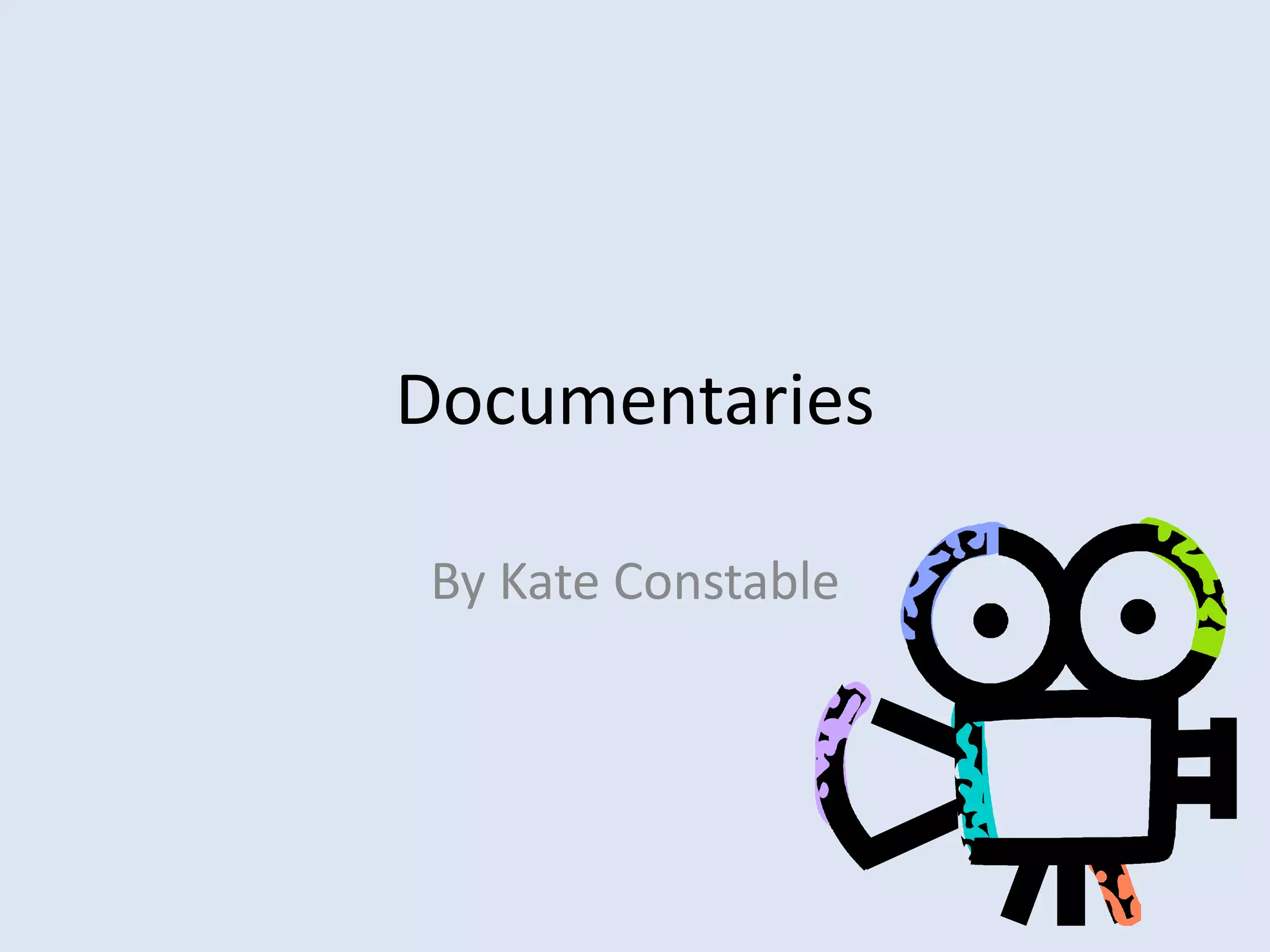 A documentary aims to document and inform audiences about aspects of reality. John Grierson first coined the term "documentary" to refer to the creative treatment of actuality. There are several types of documentaries including fully narrated documentaries which use voiceover narration to help audiences understand events, mixed documentaries which use interviews and archived footage to advance an argument, and self-reflexive documentaries where subjects acknowledge the camera. Key features of documentaries include interviews with experts, observational footage, dramatizations of real events, and mise-en-scene techniques to frame shots effectively and support the documentary's argument.