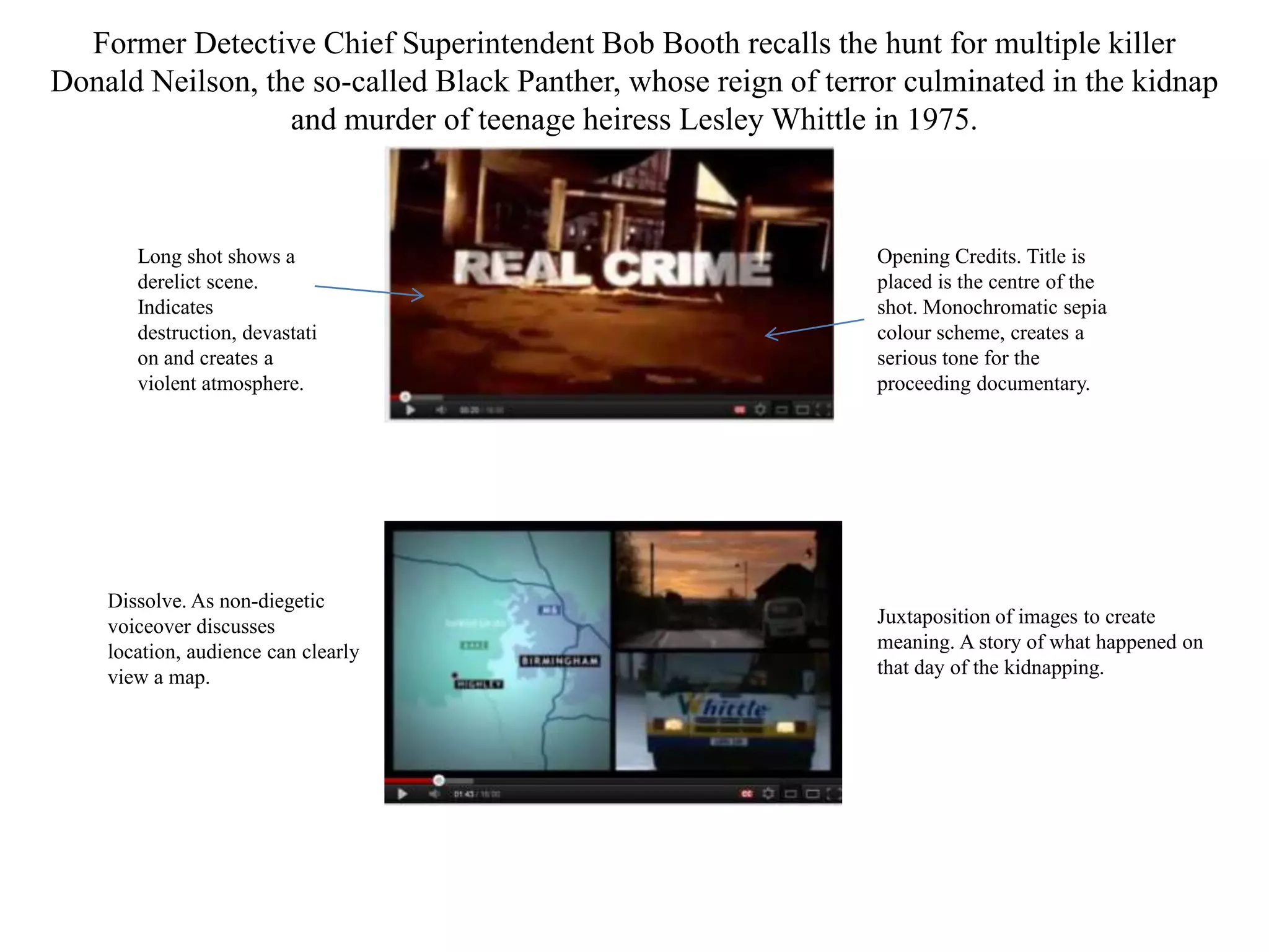 Former Detective Chief Superintendent Bob Booth recalls the hunt for serial killer Donald Neilson, known as the Black Panther, whose crimes culminated in the 1975 kidnapping and murder of teenage heiress Lesley Whittle. Footage and interviews are used to tell the story of Neilson's reign of terror and the police investigation into Whittle's kidnapping. Stylistic elements like music, sound effects, and production techniques are employed to construct an atmosphere of seriousness and realism around recounting this true crime case.