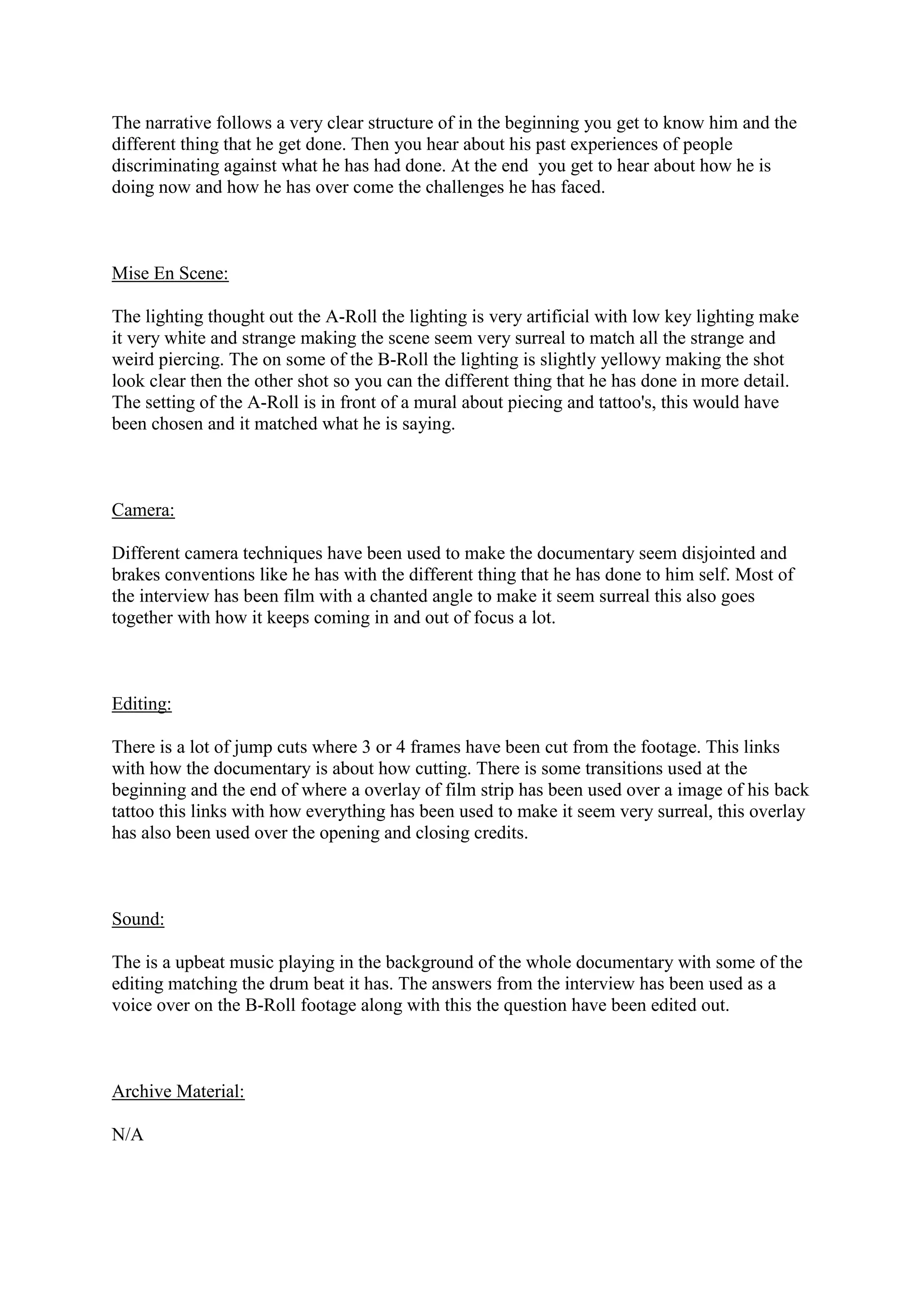 The documentary follows a man from Sydney who has heavily modified his body with tattoos and piercings. It explores people's reactions to his alterations, both negative and positive, as well as themes of body image and individuality. The documentary uses experimental film techniques like disjointed camerawork and jump cuts to match the unconventional subject and challenge viewers' expectations.
