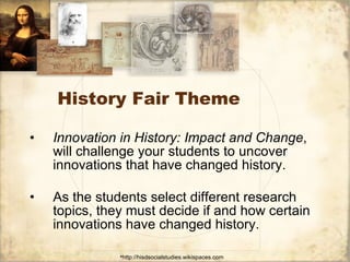 The document provides guidance for students creating documentaries for a history fair on the theme of innovation and its impact. It discusses choosing an innovation to research and considering how and why it happened, its effects, and reactions to it. Students should allow their documentaries to make meaningful connections to the theme through strong content, perspective, and appropriate use of technology. Good documentaries integrate narrative, content, and different media types like graphics and video clips seamlessly. Students are advised to plan their projects by brainstorming ideas, considering audience and purpose, scripting a narrative, and storyboarding before collecting and creating necessary images and audio. The document recommends free software options and resources for images and audio as well as copyright guidelines for students' document