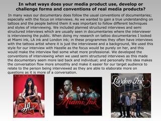 The document discusses the ways in which the media product uses and challenges documentary conventions. It follows conventions such as using different styles of interviews but also challenges conventions by using younger voices for voiceovers and different genres of music. Audience feedback was gathered and showed that transitions worked well but the interview could have been improved. New media technologies like iMovie, Garageband, blogs and word clouds were used for construction, research and evaluation.