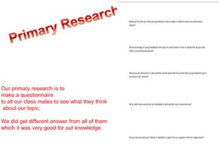 The document summarizes research conducted for a project on the challenges of becoming a professional football player. It outlines primary research through a questionnaire to classmates and secondary research from two news articles. One article discusses burnout in young footballers trying to make it professionally. The other profiles a 16-year-old who failed in a football academy and is unsure of his next steps. The document also lists some names involved in football and states the project's topic is on what it takes to achieve a professional football career.