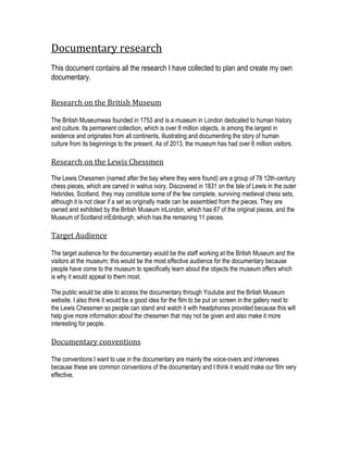 This document contains research for a planned documentary on the British Museum and the Lewis Chessmen. It summarizes that the British Museum was founded in 1753 and houses over 8 million objects from around the world. It also explains that the Lewis Chessmen were discovered in 1831 in Scotland and are comprised of 78 medieval chess pieces made of walrus ivory. The target audience for the documentary would be visitors to the British Museum to educate them about objects in the museum's collection. It proposes distributing the documentary on YouTube and the museum's website, and displaying it in the gallery near the Lewis Chessmen.