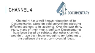 This document provides examples of documentaries produced by Channel 4 in the UK. It discusses documentaries that have explored controversial topics like "The Secret Life of Living Dolls" which profiles men who transform themselves into dolls. It also mentions the observational medical documentary "One Born Every Minute" and "My Brother, the Murderer" which follows a woman meeting her convicted murderer brother. Stylistic techniques used across documentaries like montages, interviews, hashtags for audience involvement are also outlined. Overall the document serves to showcase Channel 4's reputation for bold documentary storytelling and provides examples of their productions tackling intriguing real-life subjects.