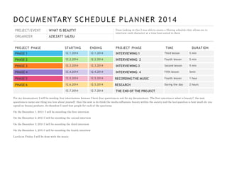 Aziezzat Salisu created a filming schedule for their documentary project titled "What is Beauty?". The project is split into 6 phases from December 1st to December 7th 2014. It involves interviewing 4 characters between the 2nd to 5th lesson over 5 minutes each on different dates. Music recording is scheduled for the 4th lesson lasting 1 hour. Research will be done during the day for 2 hours. The documentary aims to answer questions about beauty through 4 interviews.