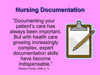 This document provides guidance on nursing documentation for novice and experienced nurses. It discusses the importance of documentation for continuity of care, quality management, and legal protection. It reviews different documentation systems and tools used at Bethesda Memorial Hospital, including shift assessments, nurses' notes, problem lists, and incident reports. Examples of proper documentation formats are also provided. The reference stresses that nursing documentation must be thorough yet concise to tell the patient's story factually without judgments.