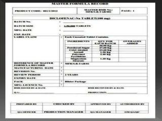 The document discusses documentation processes in organizations. It explains that documentation involves systematically recording people, events, and documents to create organizational records. Documentation provides information on how to complete tasks as well as evidence that tasks were done correctly. Master formula records (MFRs) are important documentation that contain all information about a pharmaceutical product's manufacturing process. MFRs are prepared by research teams and used as a reference for batch manufacturing records. The document outlines the key components that should be included in MFRs and batch manufacturing records to ensure consistency in manufacturing batches. It also discusses standard operating procedures and importance of documentation policies in organizations.