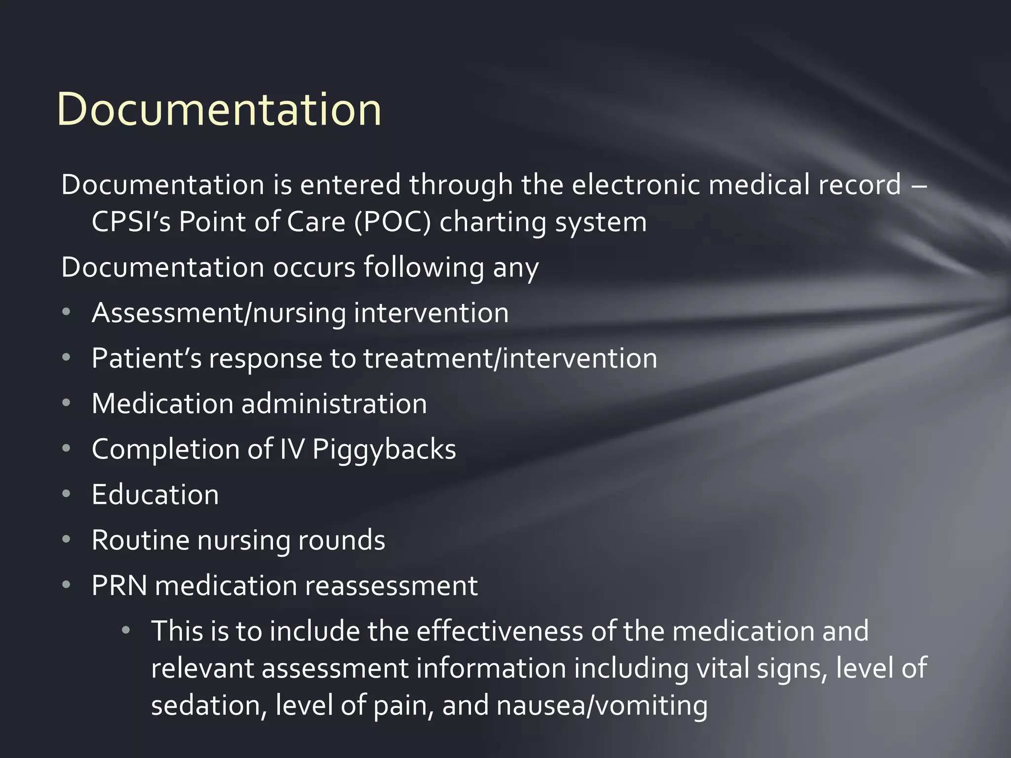 Nurses document patient care in the electronic medical record system. Documentation includes assessments, interventions, patient responses, medication administration, education provided, and routine checks. Physical assessments are done within 8 hours of admission and every shift, with problems addressed in the problem list. Orders are dated, timed, and read back to ensure accuracy. The problem list guides care and is updated as goals are met or conditions change.